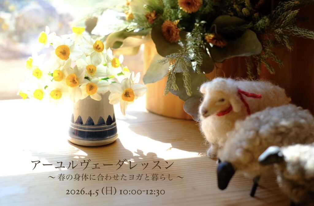 アーユルヴェーダレッスン 2025冬〜 呼吸と瞑想でゆるめる朝 〜 静かに自分自身とつながる時間は、心身の緊張をゆるめリラックスする(副交感神経が優位になり)ことで、体を冷えから守ってくれます。秋から冬にかけて「風」の質(乾燥、冷え、動き)が増… -